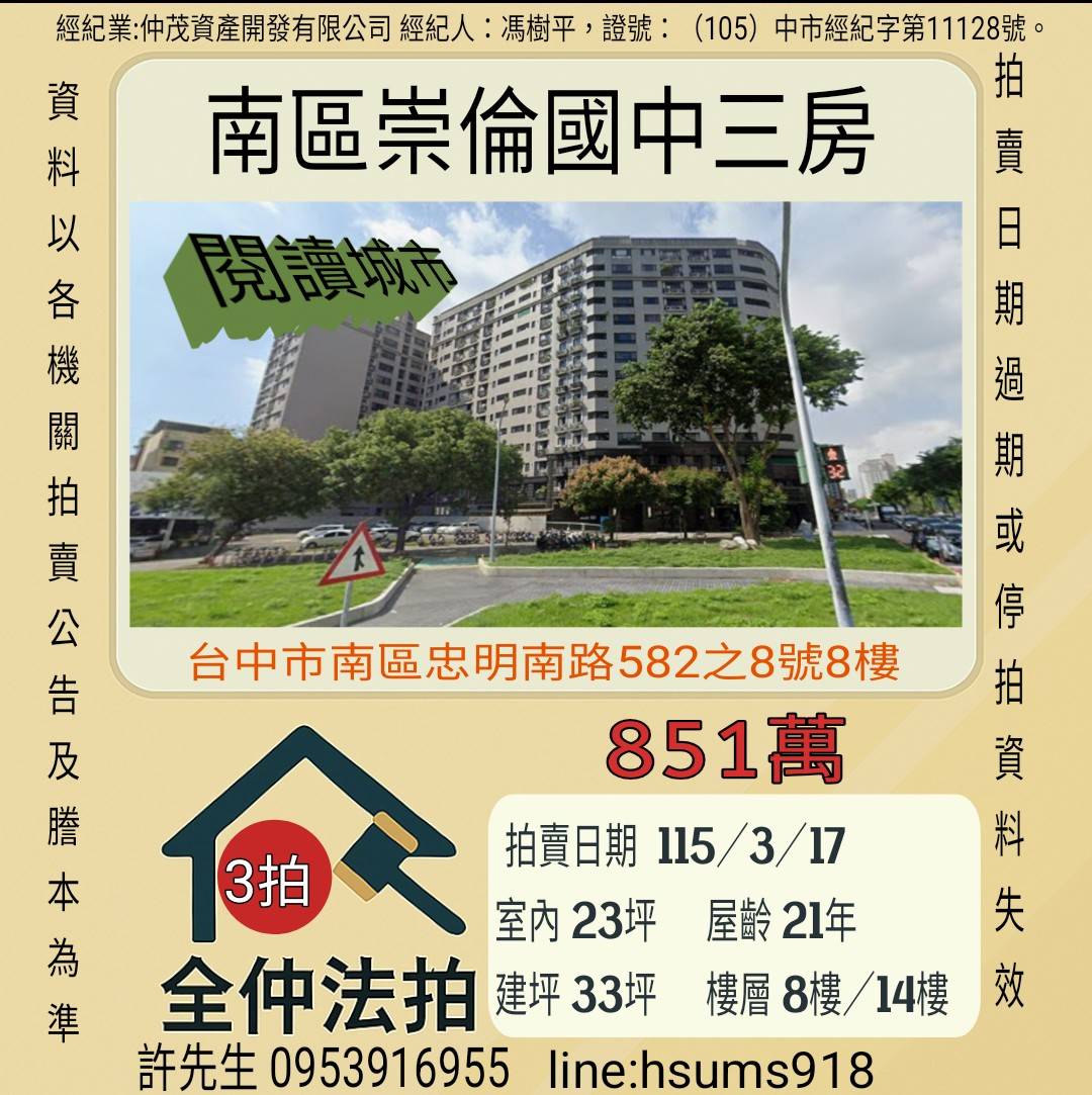 經紀人:馮樹平,證號:( 105)中市經紀字第 01728 號。