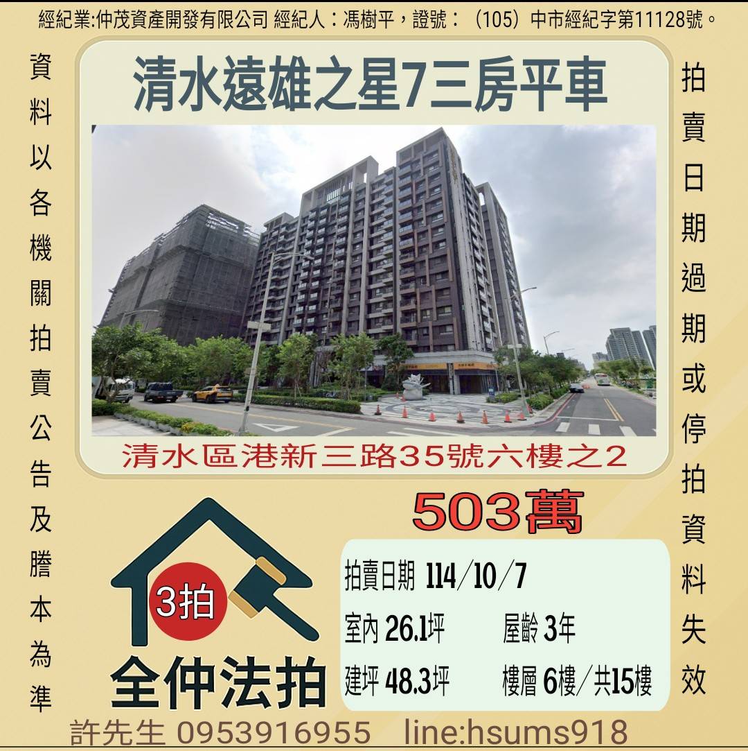 經紀人:馮樹平,證號:( 105)中市經紀字第 01728 號。