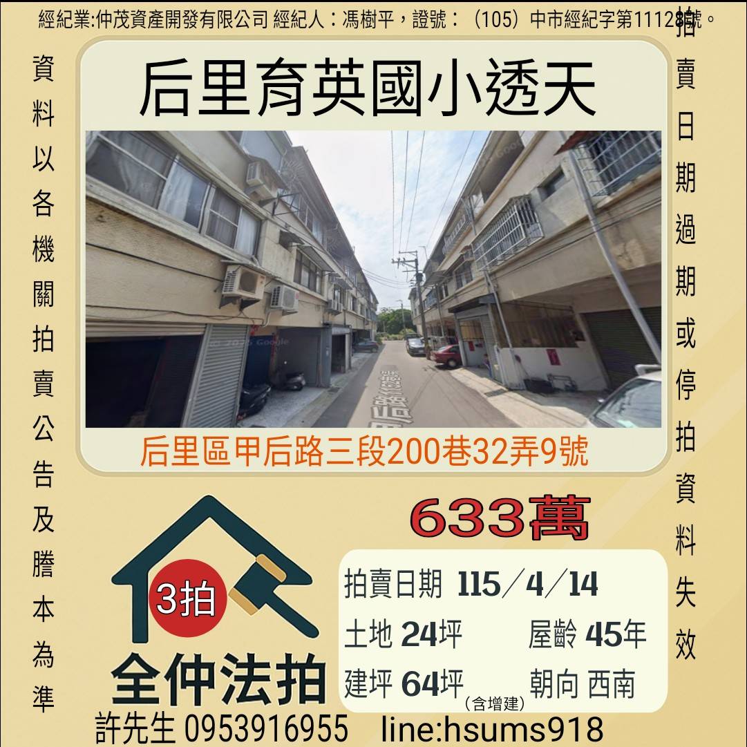 經紀人:馮樹平,證號:(105)中市經紀字第11128號。