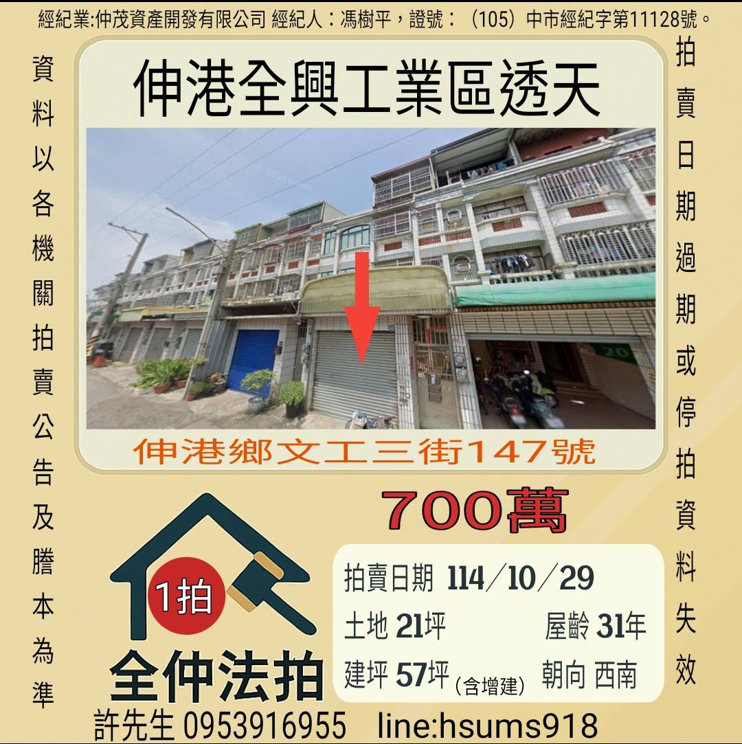 經紀人:馮樹平,證號:( 105)中市經紀字第 01728 號。