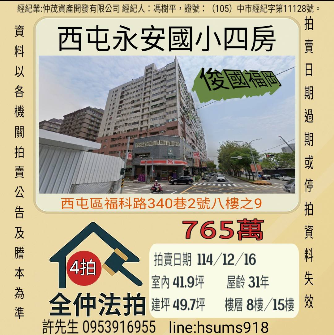 經紀人:馮樹平,證號:( 105)中市經紀字第 01728 號。