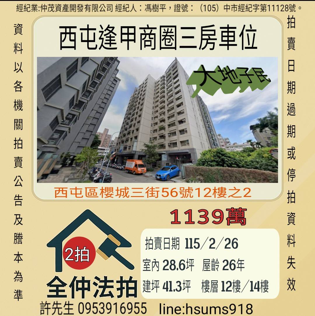 經紀人:馮樹平,證號:(105)中市經紀字第11128號。