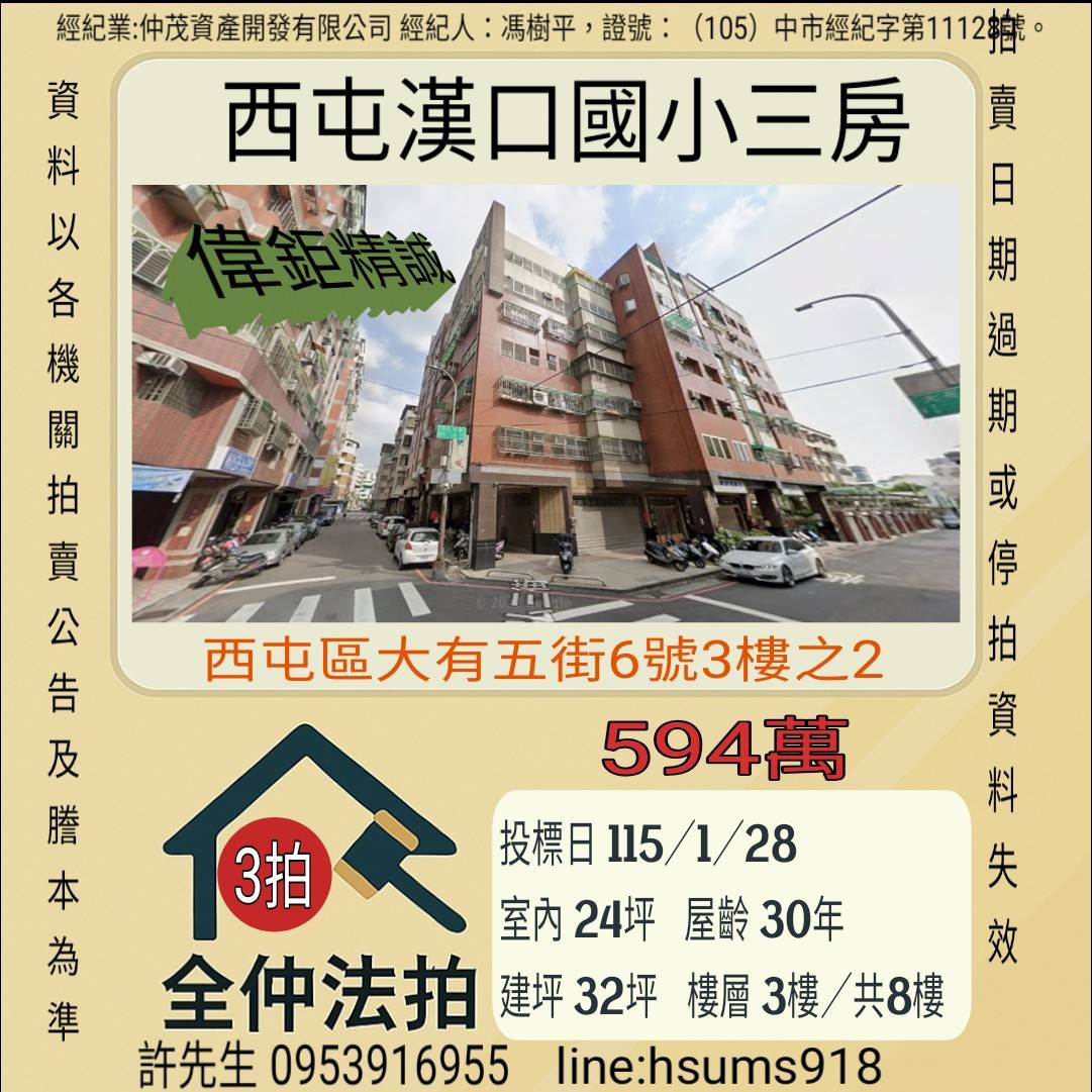 經紀人:馮樹平,證號:( 105)中市經紀字第 01728 號。