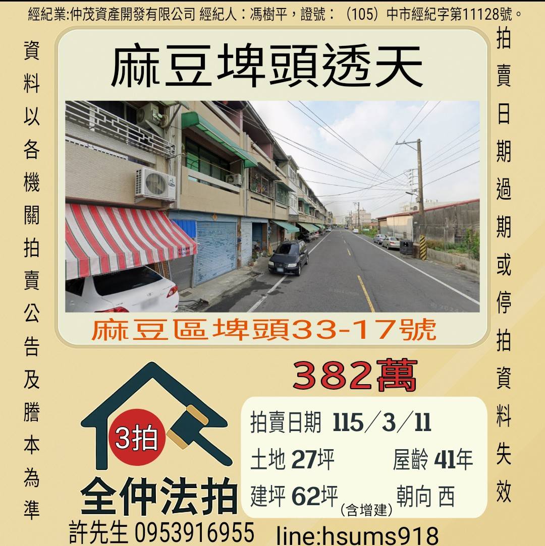 經紀人:馮樹平,證號:(105)中市經紀字第11128號。