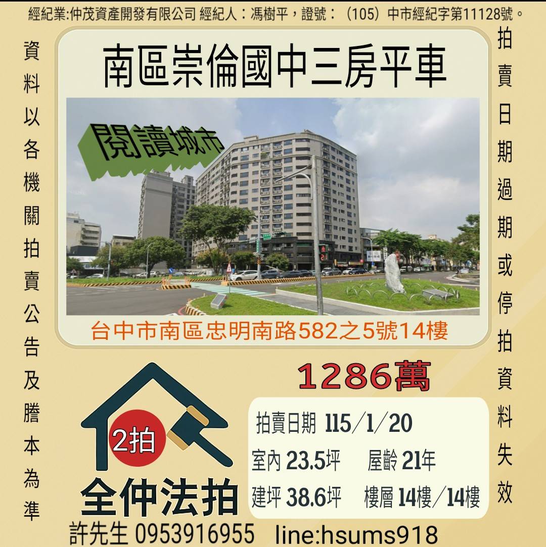 經紀人:馮樹平,證號:( 105)中市經紀字第 01728 號。