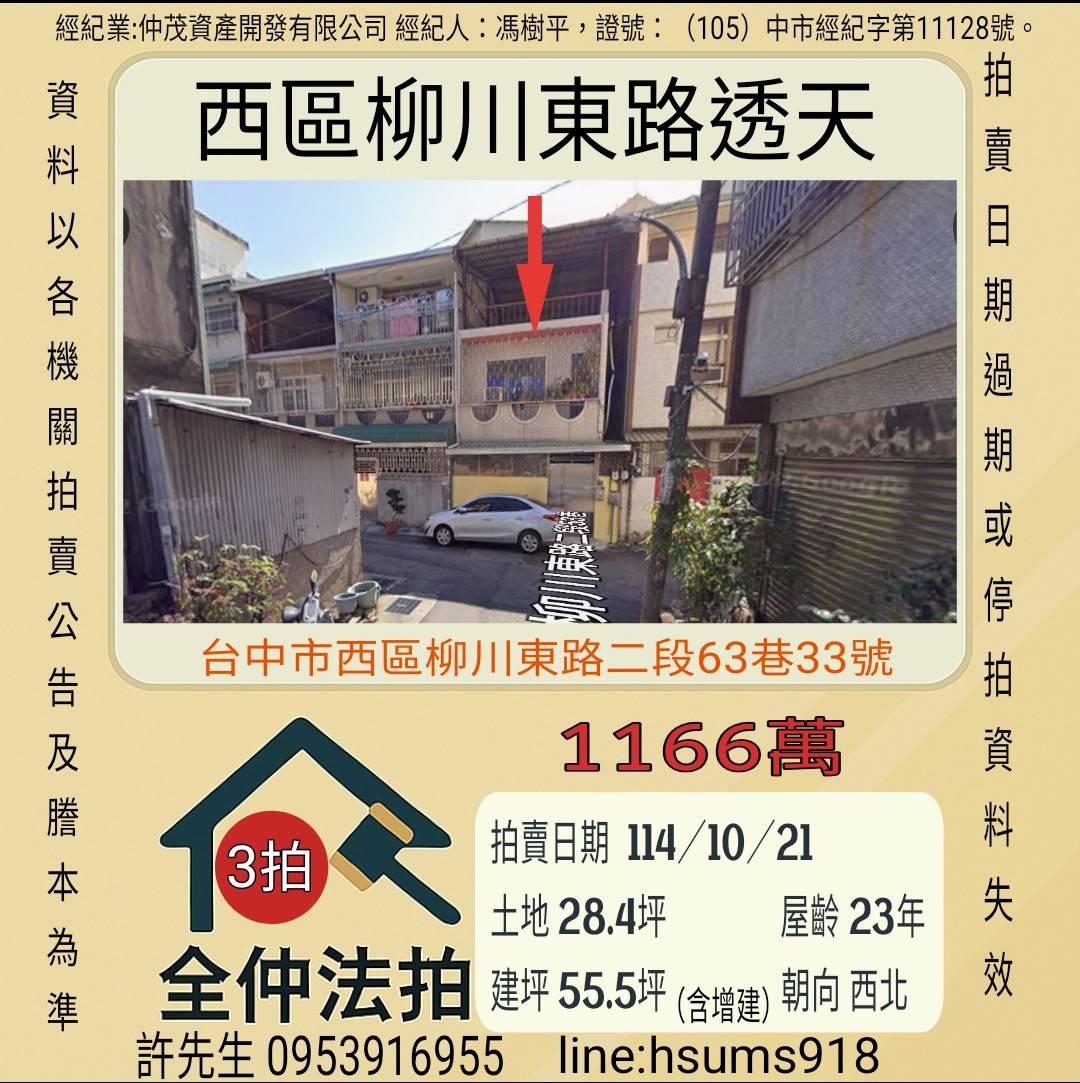 經紀人:馮樹平,證號:(105)中市經紀字第11128號。