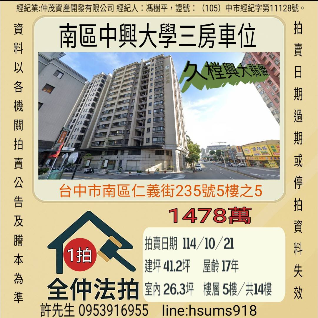 經紀人:馮樹平,證號:(105)中市經紀字第11128號。
