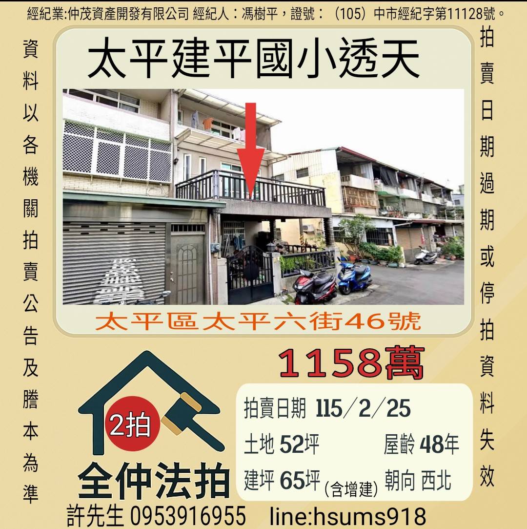 經紀人:馮樹平,證號:( 105)中市經紀字第 01728 號。