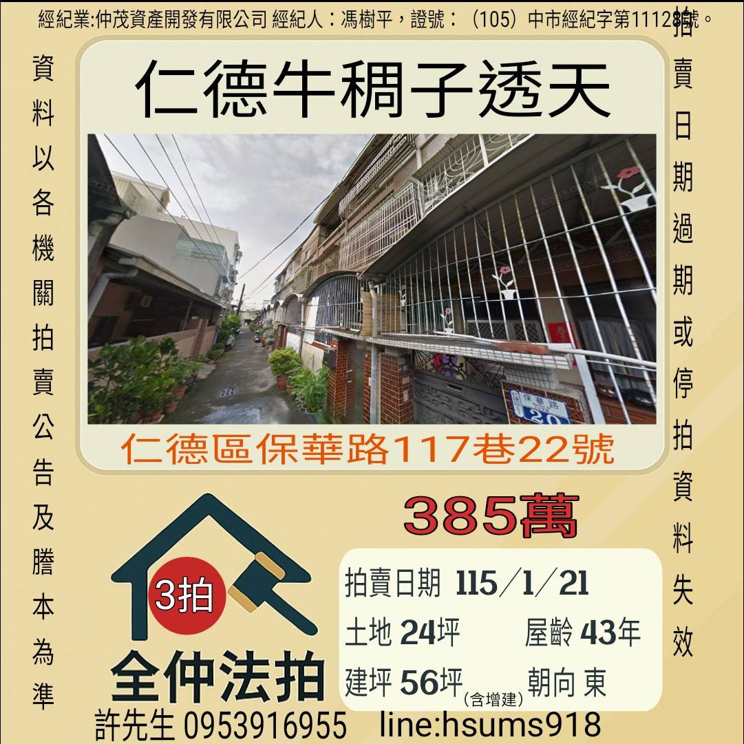 經紀人:馮樹平,證號:( 105)中市經紀字第 01728 號。