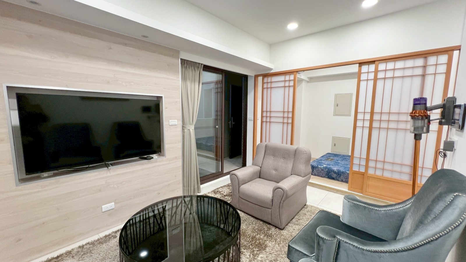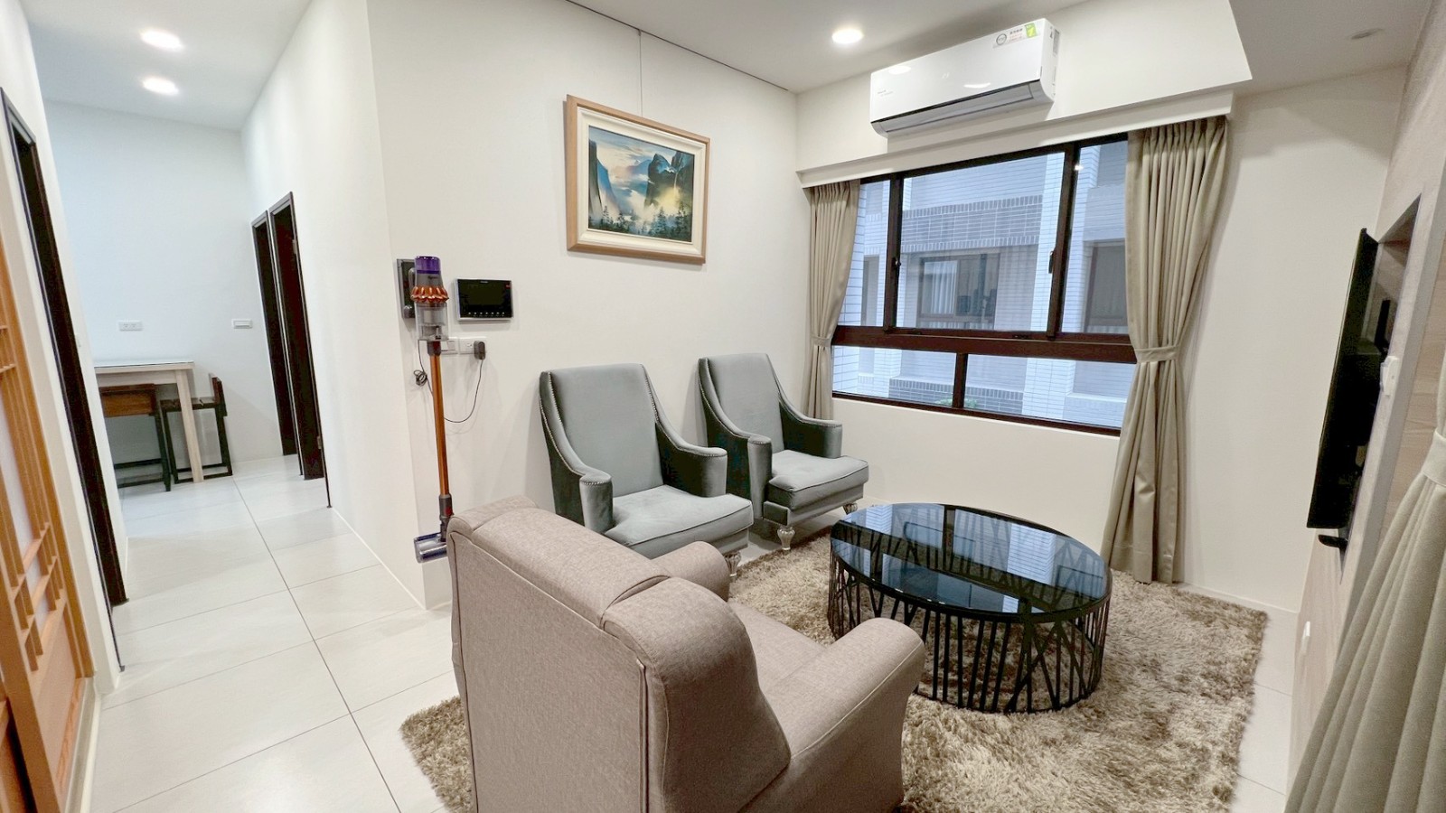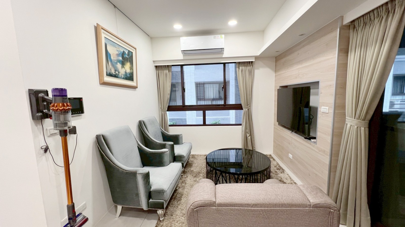 ✶ 客廳落地窗、大面窗明亮雙面採光,有裝潢窗簾盒,附質感窗簾、電視牆、古典沙發椅及防貓抓沙發椅、圓形大茶几、暖和大地毯、天花板崁燈自然光氛圍設計