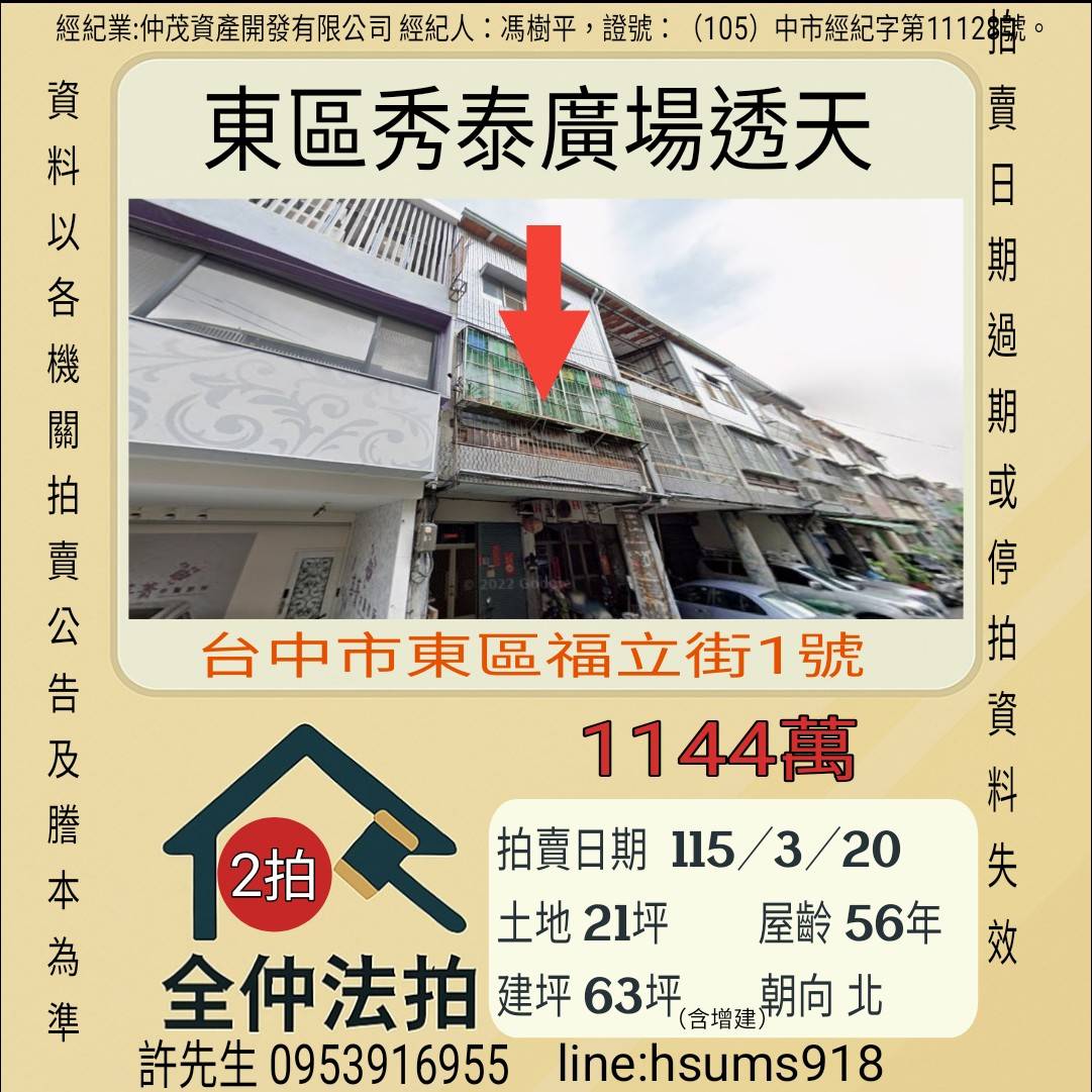 經紀人:馮樹平,證號:(105)中市經紀字第11128號。