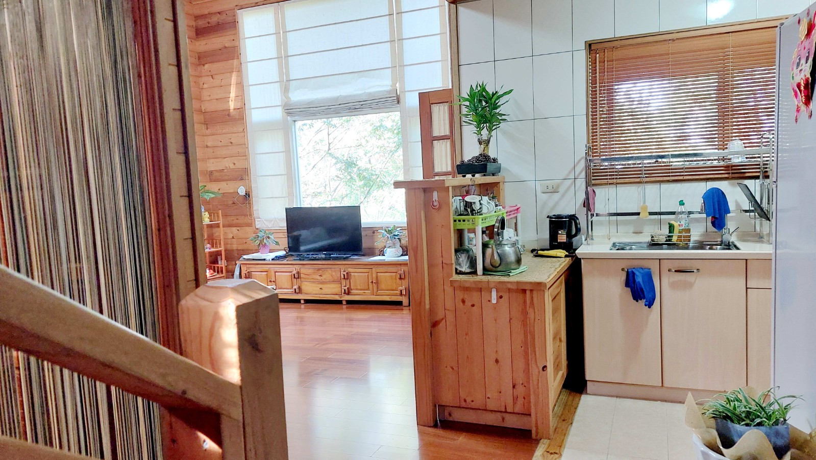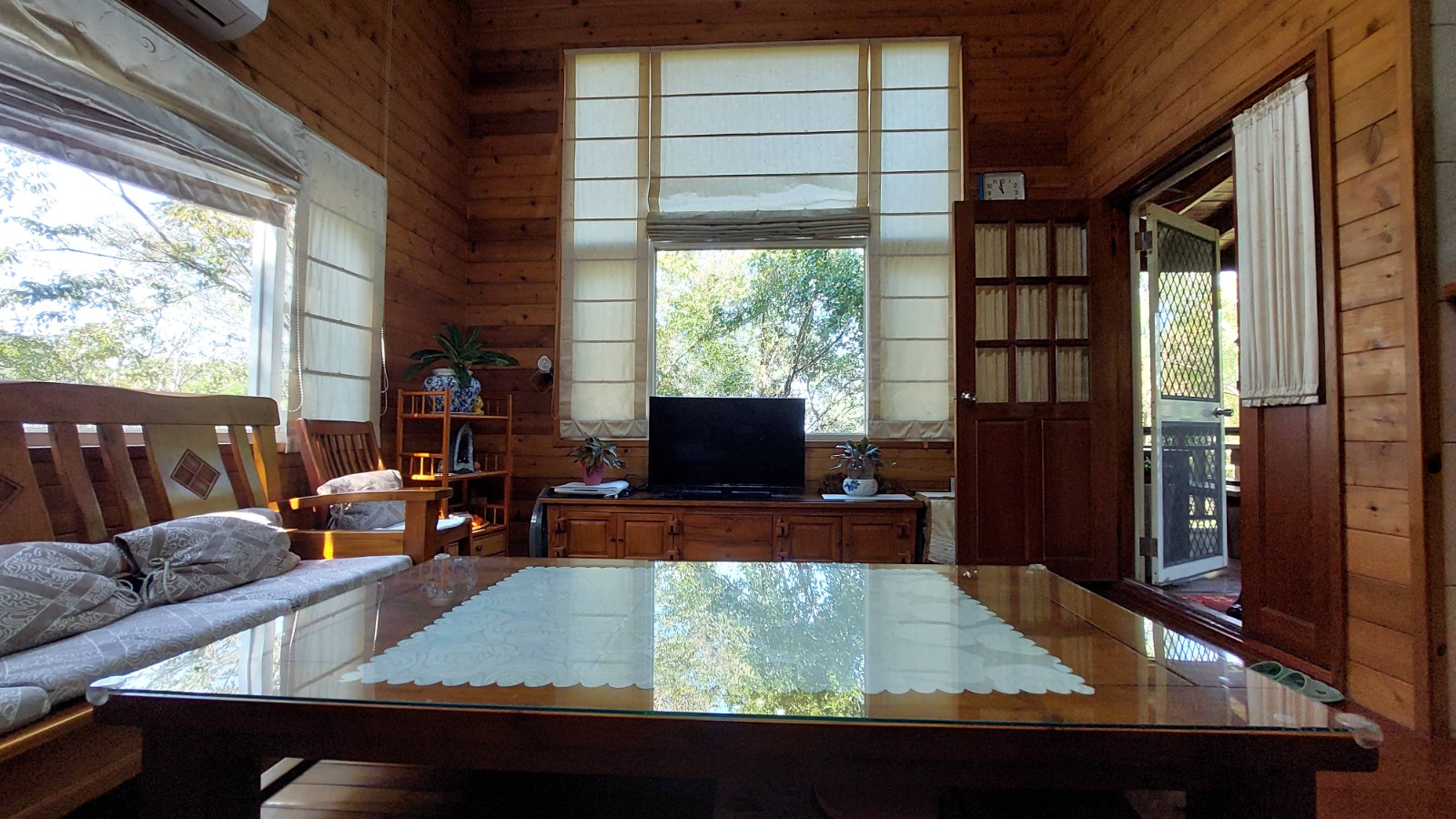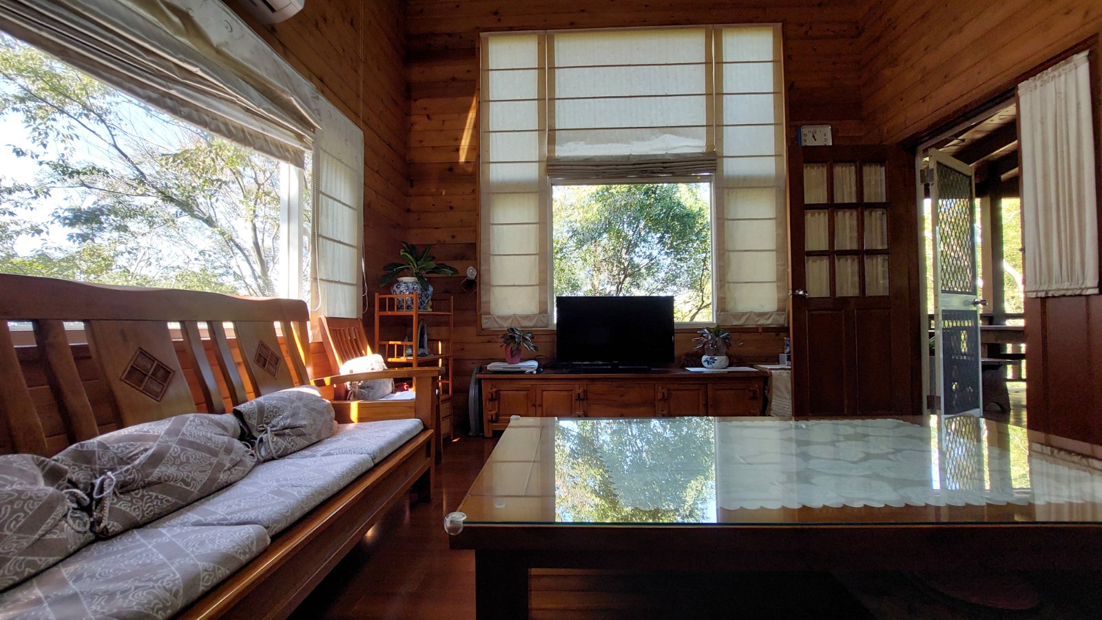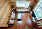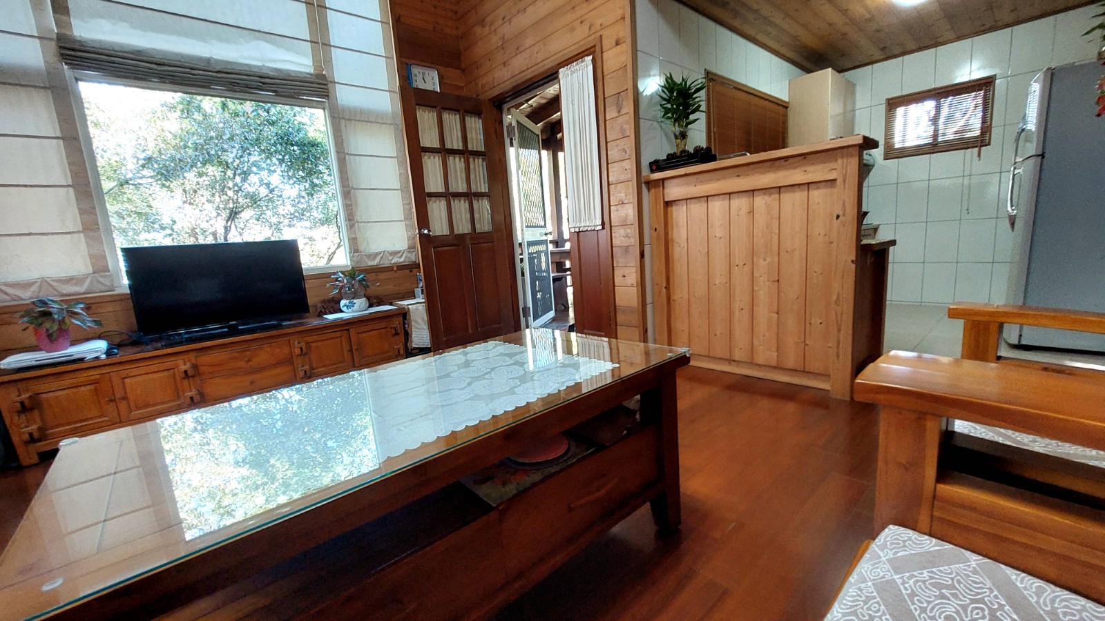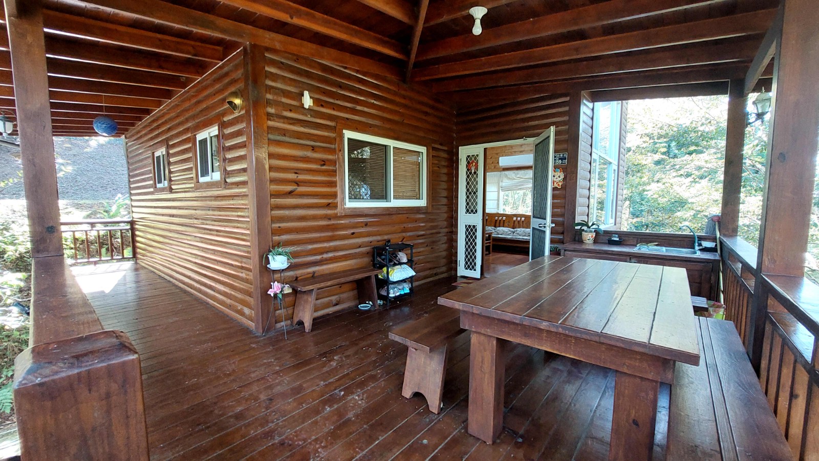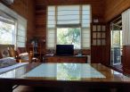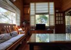 4.木屋屋齡約15年、使用山泉水、桶裝瓦斯、可申請網路。步入室內,濃鬱而溫潤的木頭香氣撲鼻而來。高挑的客廳空間感十足,搭配溫馨的木質傢俱與大片採光窗,陽光灑落在實木地板上,整體氛圍靜謐而療癒,讓人不自覺放慢腳步、放鬆身心