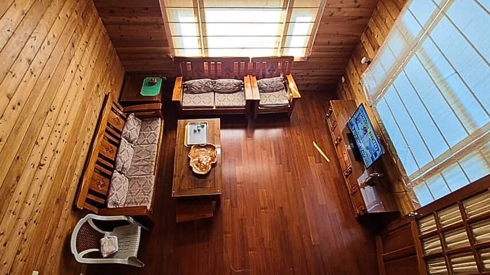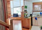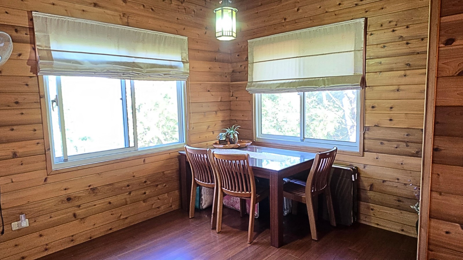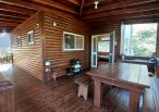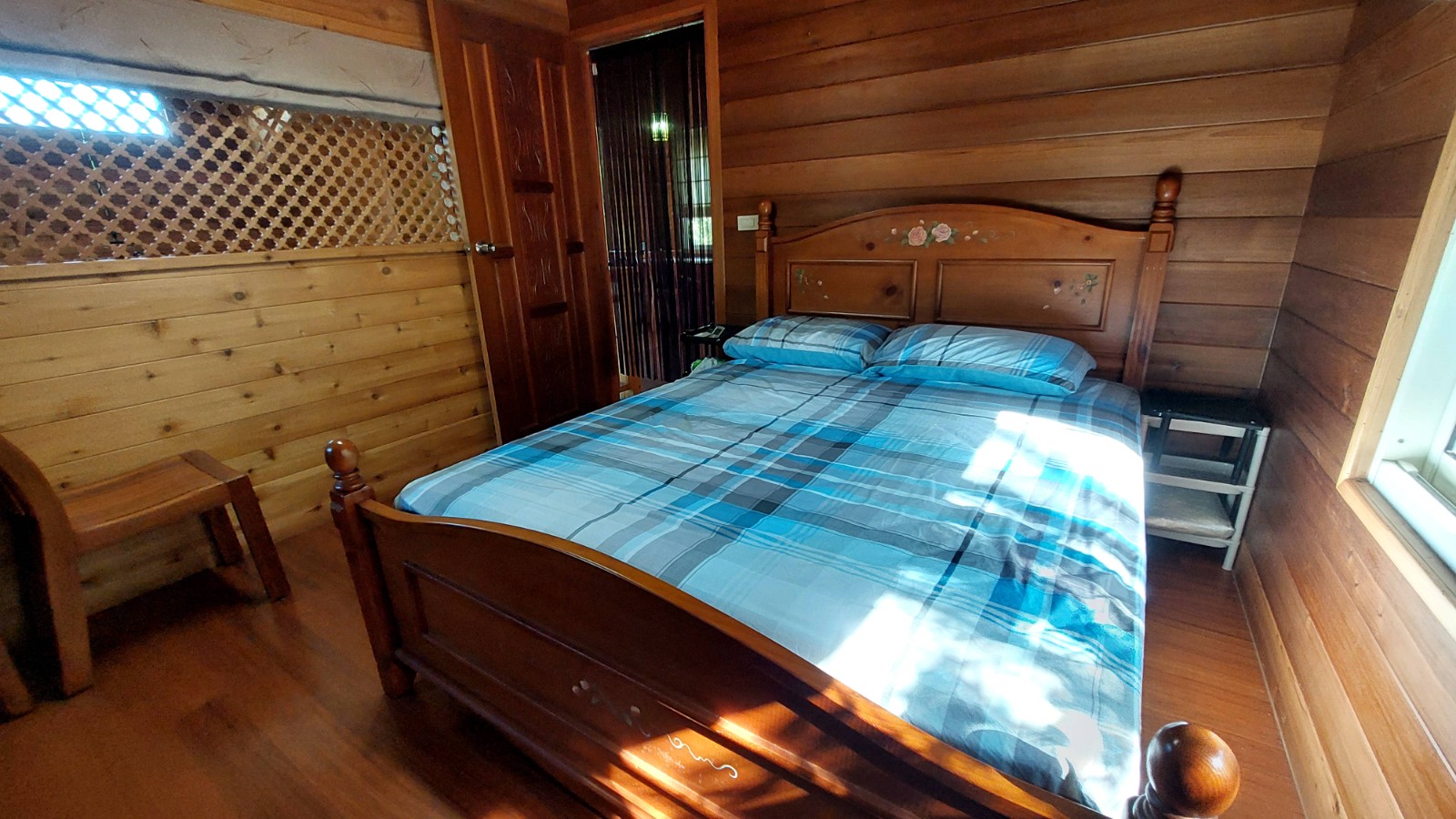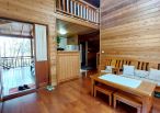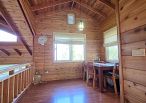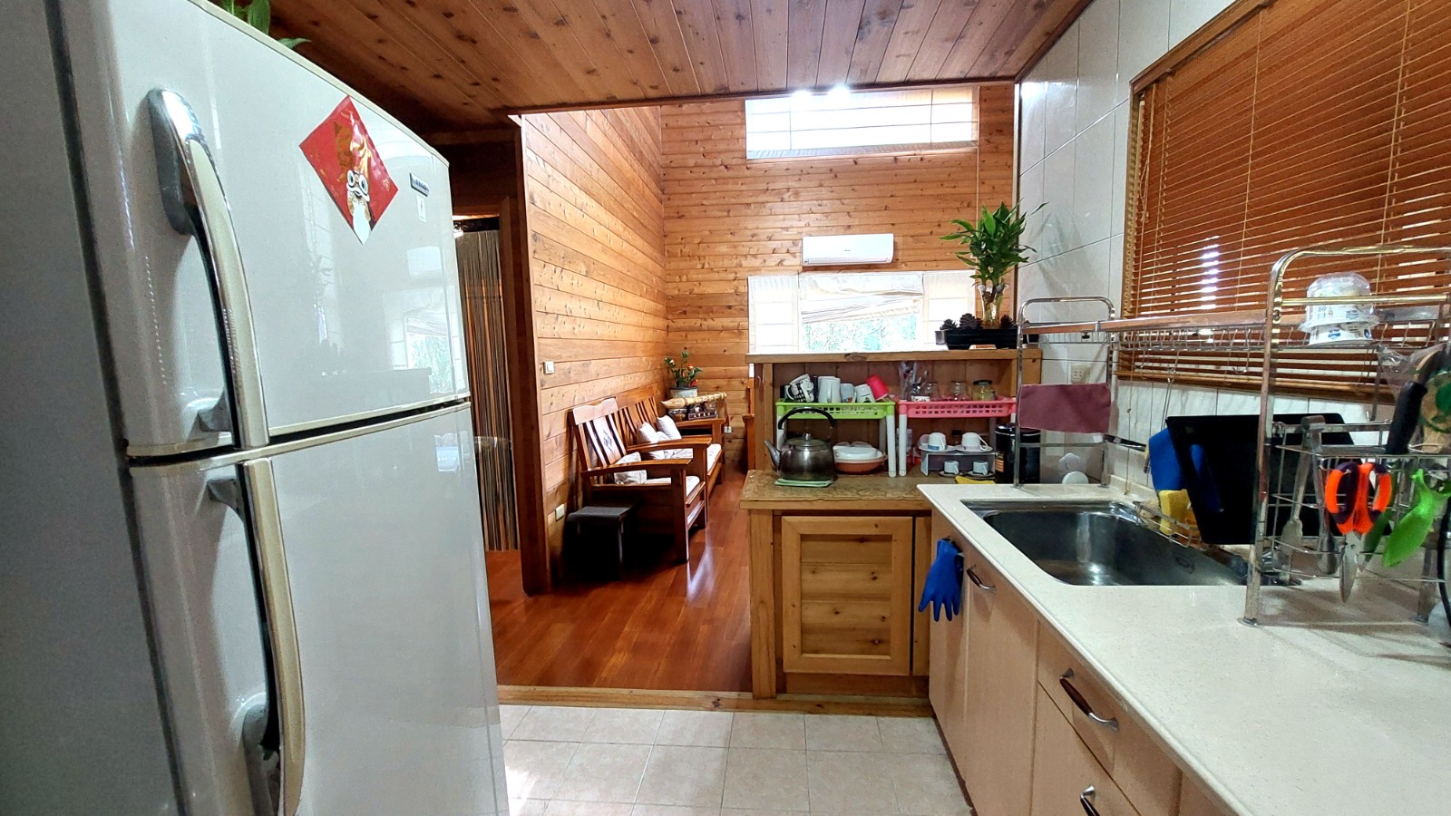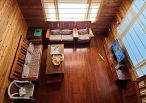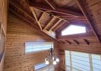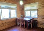 4.木屋屋齡約15年、使用山泉水、桶裝瓦斯、可申請網路。步入室內,濃鬱而溫潤的木頭香氣撲鼻而來。高挑的客廳空間感十足,搭配溫馨的木質傢俱與大片採光窗,陽光灑落在實木地板上,整體氛圍靜謐而療癒,讓人不自覺放慢腳步、放鬆身心