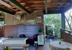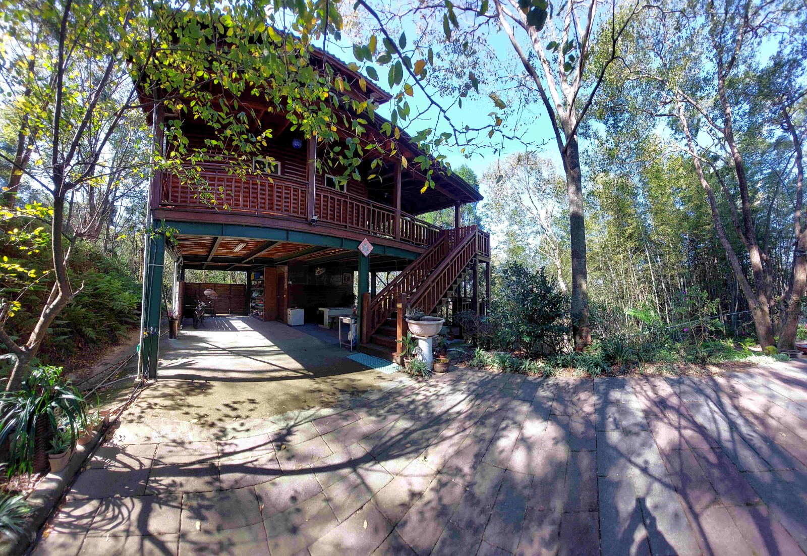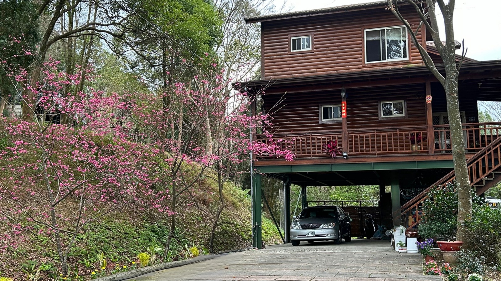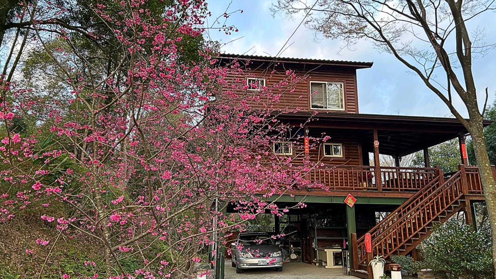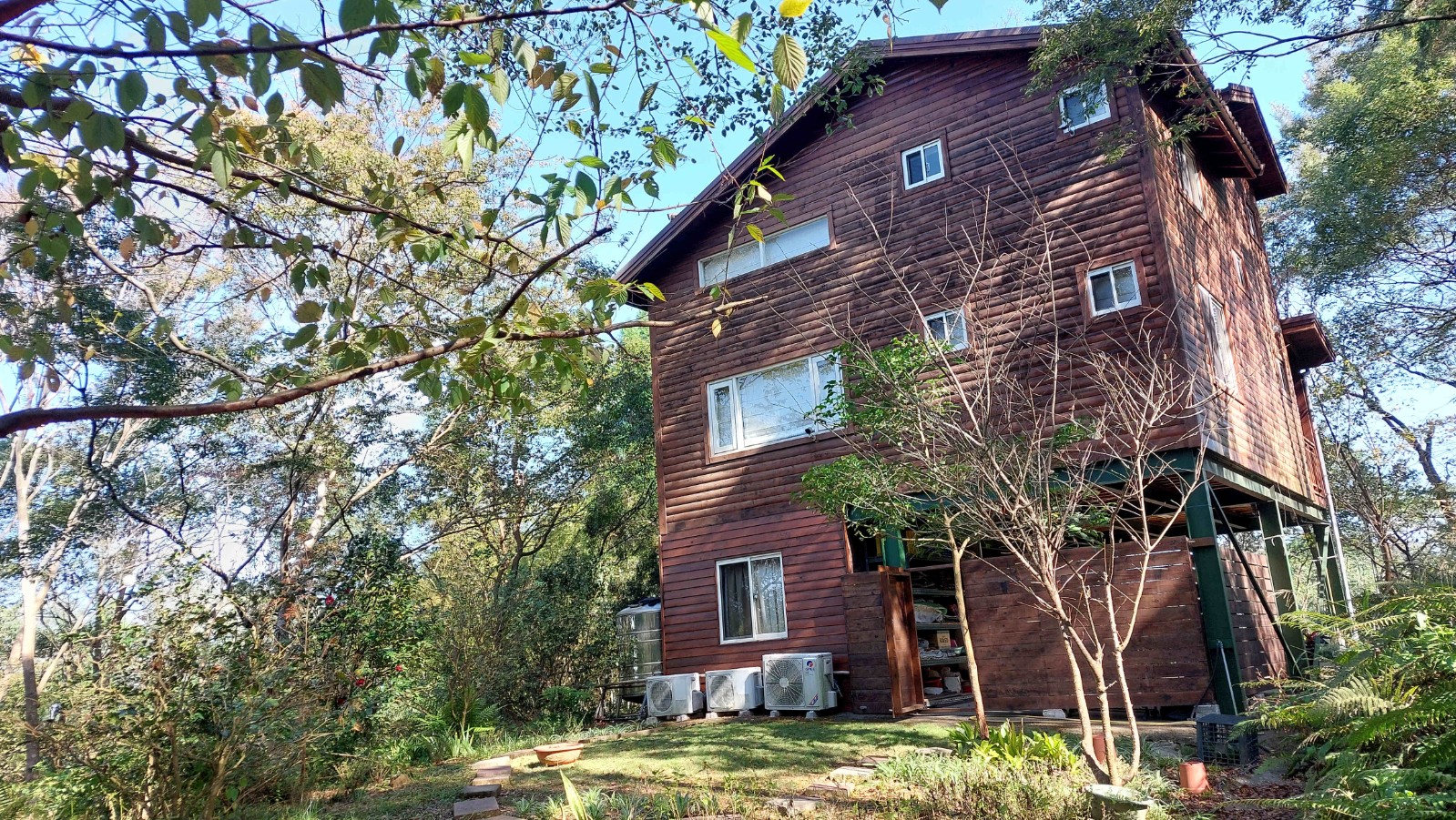3.現況為一間鋼構木屋,採挑高設計,一樓平面作為停車區域、另設有一間獨立儲藏室,用於放置水塔、瓦斯桶及各式農用資材,收納機能完善。拾階而上,二樓為大坪數木造露台,空間寬敞開闊,無論午後品茗、賞景小憩,皆是難得的愜意享受