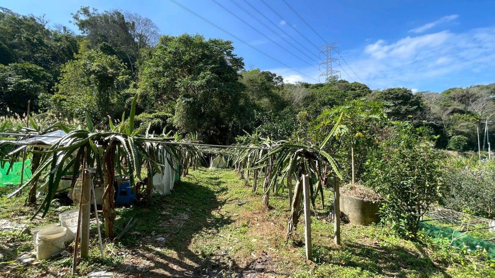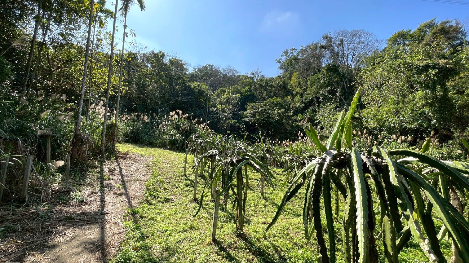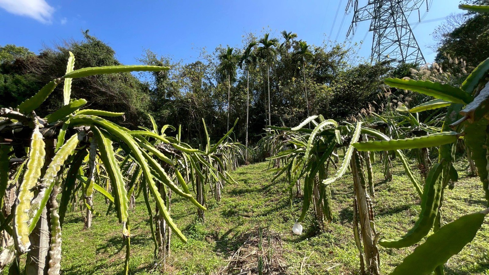 2.農地海拔約85公尺,地勢平坦、視野開闊,整體環境舒適宜人;現況主要農作以火龍果為主,年產量約200~300台斤,另輔以少量芭樂、香蕉、柚子、木瓜、薑黃及葛鬱金等作物,作物種類多元,具備良好的耕作基礎與發展彈性