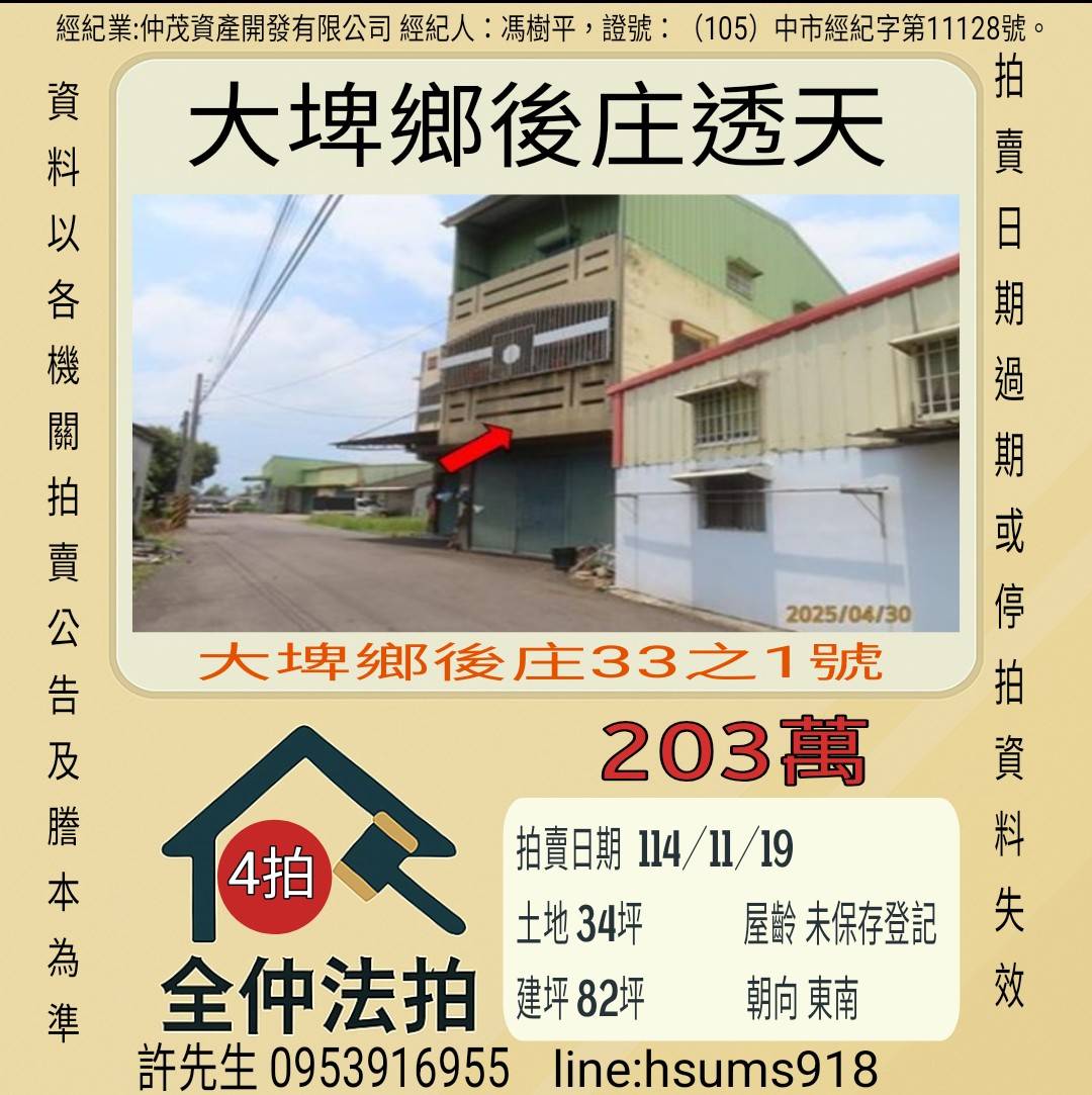經紀人:馮樹平,證號:( 105)中市經紀字第 01728 號。