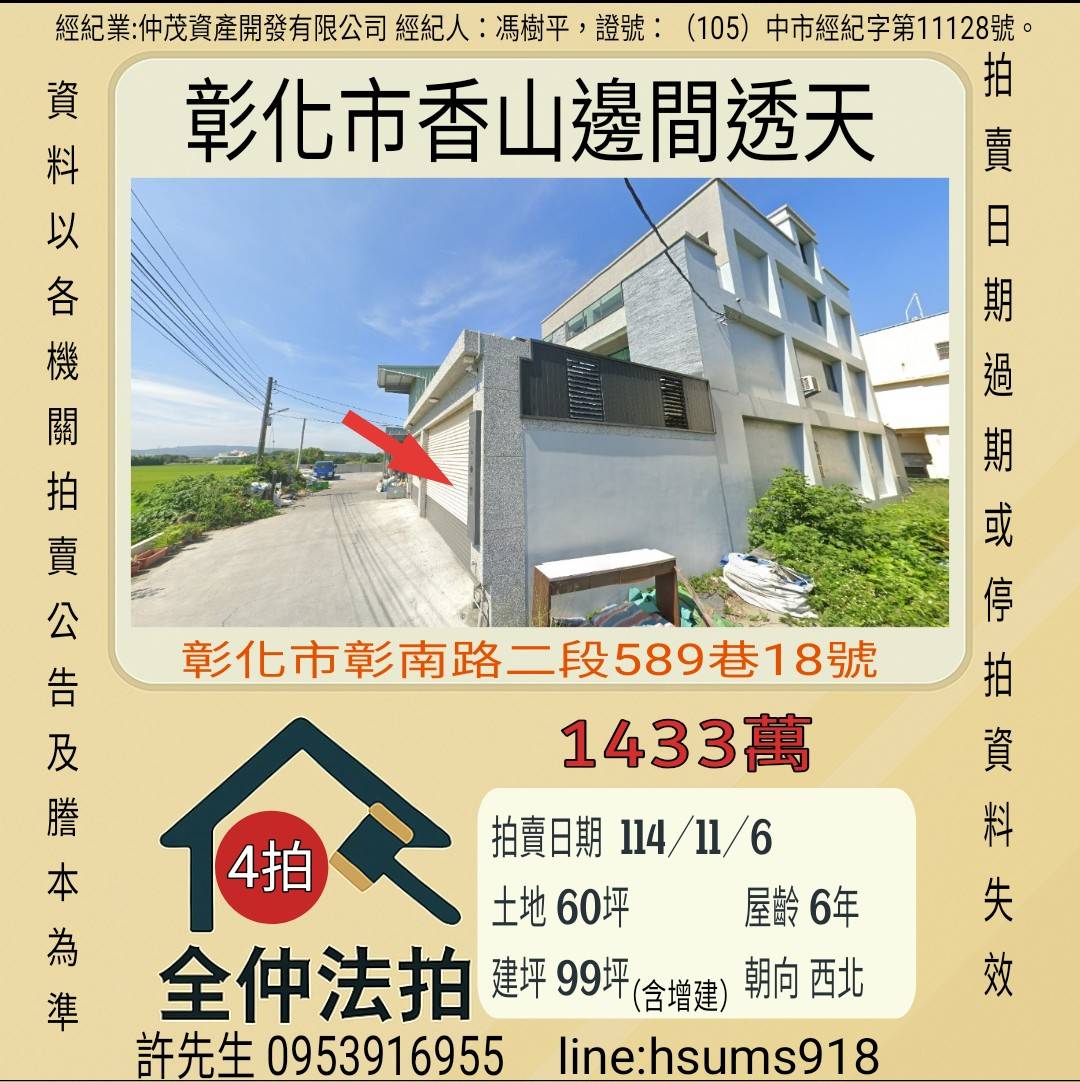 經紀人:馮樹平,證號:( 105)中市經紀字第 01728 號。