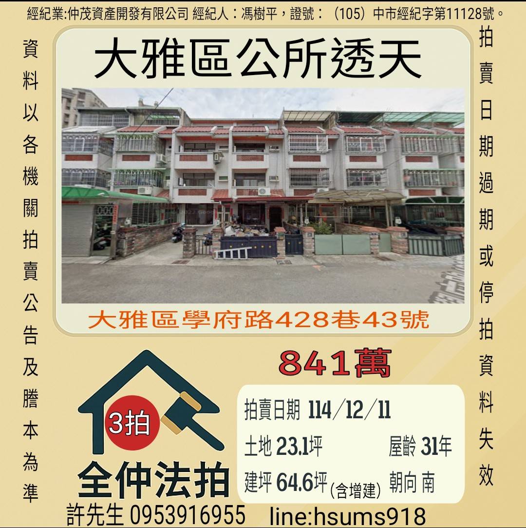經紀人:馮樹平,證號:(105)中市經紀字第11128號。