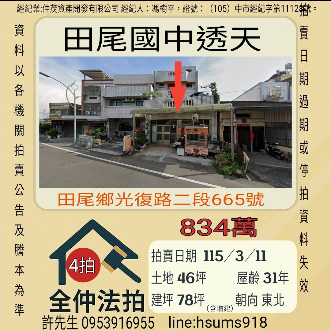 經紀人:馮樹平,證號:( 105)中市經紀字第 01728 號。