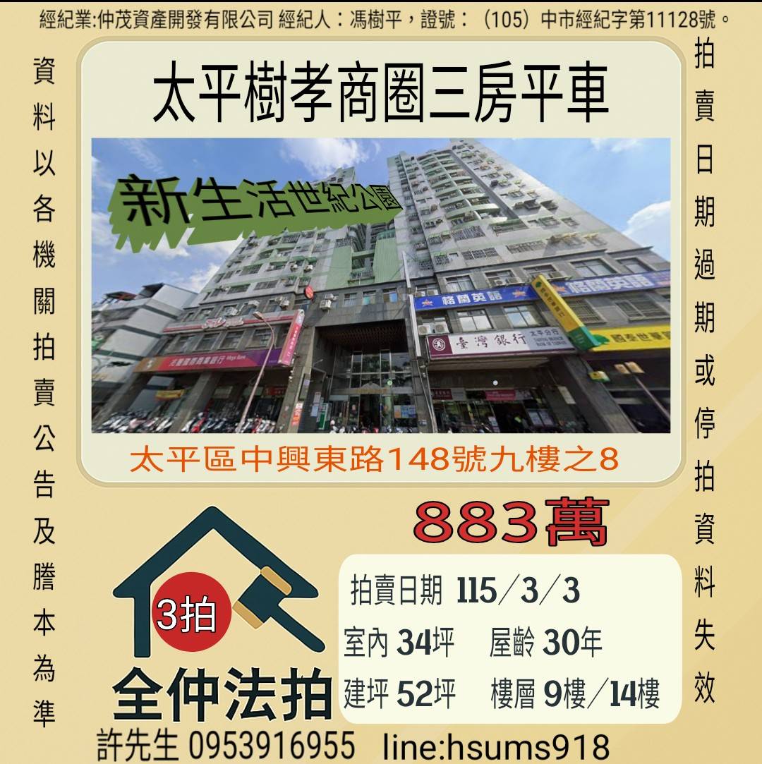 經紀人:馮樹平,證號:(105)中市經紀字第11128號。