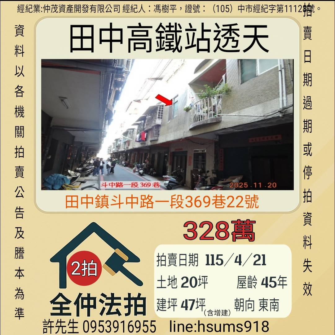 經紀人:馮樹平,證號:( 105)中市經紀字第 01728 號。