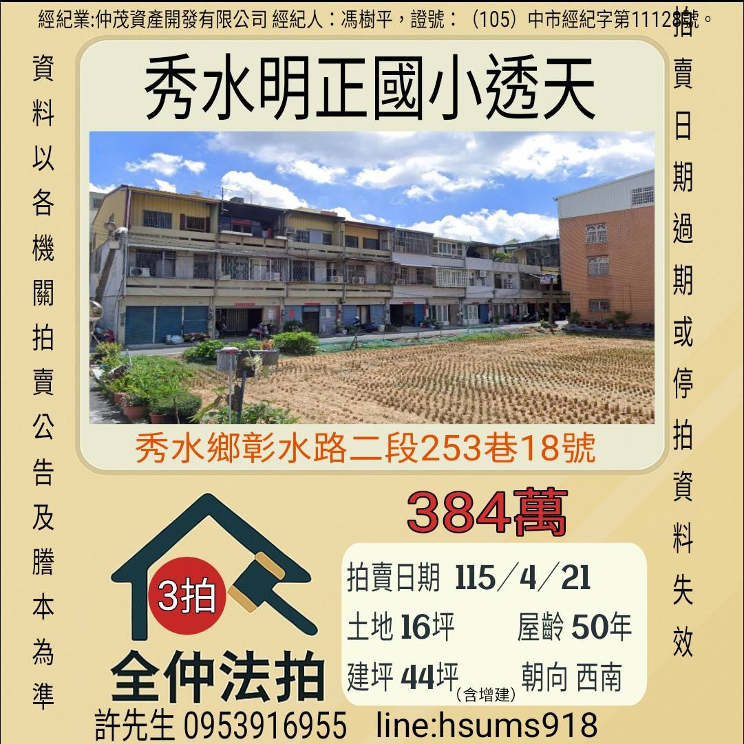 經紀人:馮樹平,證號:( 105)中市經紀字第 01728 號。